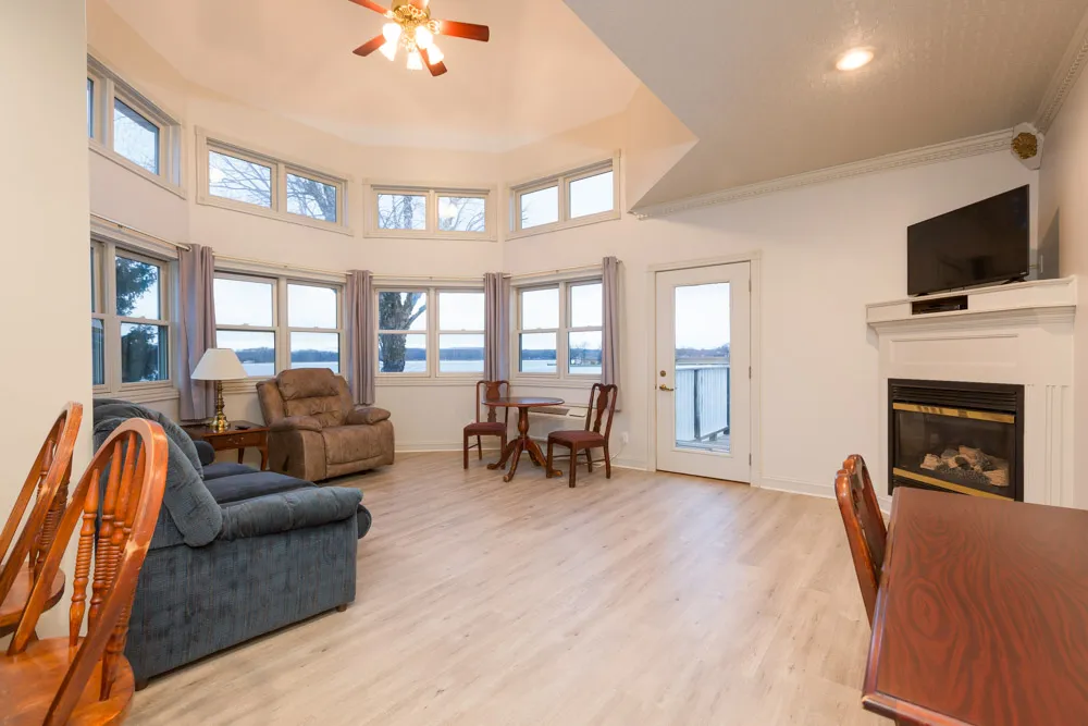 Overlooking Pine Lake, this room provides warmth and brightness for a peaceful getaway.